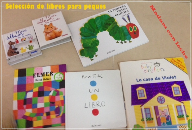 Por último, el libro La oruga glotona también le gusta muchísimo, porque es muy colorido y lleva agujeros en todas sus páginas donde puede meter sus dedos; Elmer y Un libro, los coge también a diario pero no tiene tanta fascinación por ellos, al igual que por muchos otros que tiene y no los he puesto aquí pero estoy segura de que es porque son para más edad.