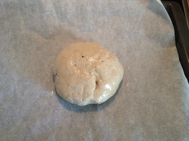 Cuando haya pasado el tiempo de levado, cogemos la bola con las manos húmedas y la ponemos en una bandeja de horno con papel vegetal y al horno.